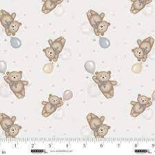 This charming fabric features a delightful pattern of gray and multi-colored flying teddy bears, each holding pastel balloons. The design is playful and whimsical, with teddy bears in various poses against a light background, creating a soft and inviting look perfect for children's projects. The teddy bears are detailed with bows and are surrounded by small stars, adding to the magical feel of the fabric. Ideal for creating baby blankets, nursery decor, or any project that needs a touch of sweetness.